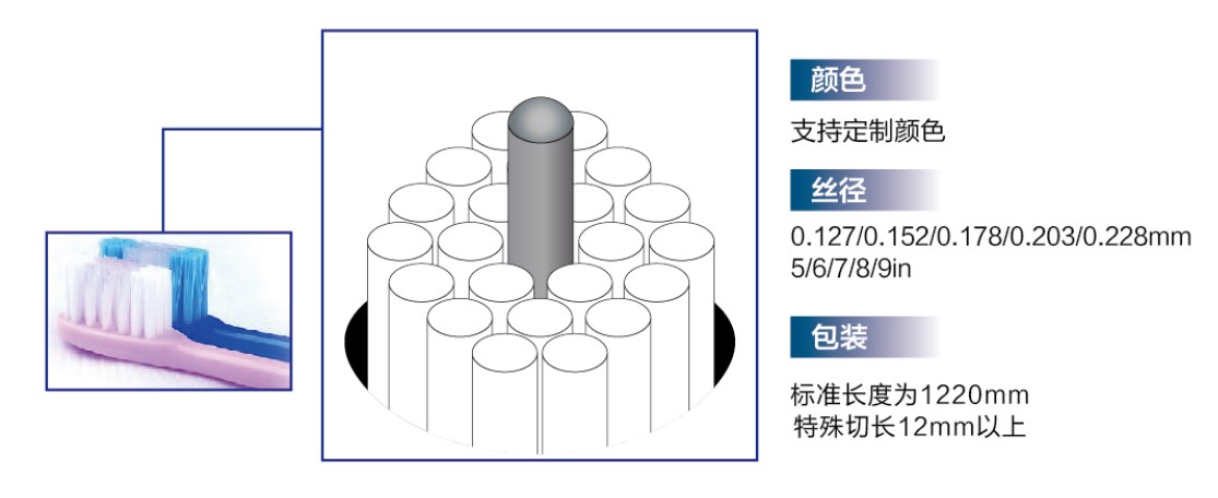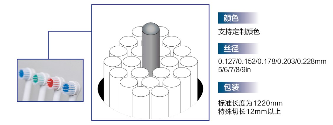 優(yōu)異的彎曲回復(fù)、卓越的耐磨性能、獨(dú)有的表面光潔度、顏色均勻、絲徑均勻、粗細(xì)均勻,剛度更高。
