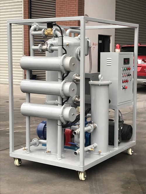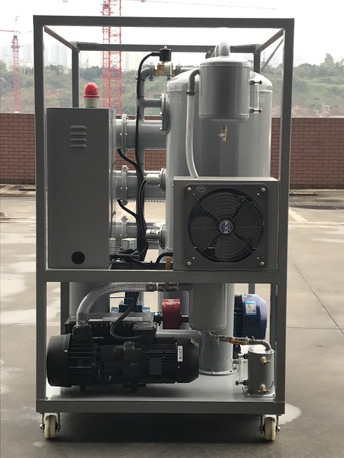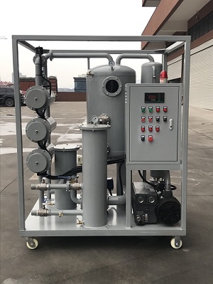 液壓油過濾機工作時,污染油液在外界大氣壓真空吸進(jìn)的作用下經(jīng)入口進(jìn)入加熱器,加熱后的油液進(jìn)入初濾器,大顆粒雜質(zhì)被濾除,然后油液進(jìn)入分水器,真空分離器,流過特制發(fā)散裝置。該發(fā)散裝置使單位體積的油液產(chǎn)生巨大的表面面積,讓污染油液曝露于相對濕度很低的真空中,從而清除油中的水、空氣和氣體。蒸發(fā)的水蒸汽、氣體所形成的混合氣體通過水箱和冷卻器冷凝成液體,一同進(jìn)入儲水器,剩余的氣體被真空泵抽出。除去水分的油液被排油泵輸入精濾器除去微粒雜質(zhì),即為凈化油,完成一個凈化過程,根據(jù)含水量的多少,須多次循環(huán)才能完全除去水分。