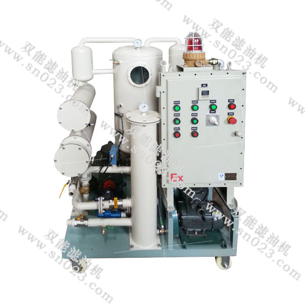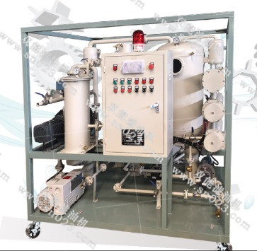潤(rùn)滑油濾油機(jī)工作時(shí),污染油液在外界大氣壓真空吸進(jìn)的作用下經(jīng)入口進(jìn)入加熱器,加熱后的油液進(jìn)入初濾器,大顆粒雜質(zhì)被濾除,然后油液進(jìn)入分水器,真空分離器,流過特制發(fā)散裝置。該發(fā)散裝置使單位體積的油液產(chǎn)生巨大的表面面積,讓污染油液曝露于相對(duì)濕度很低的真空中,從而清除油中的水、空氣和氣體。蒸發(fā)的水蒸汽、氣體所形成的混合氣體通過水箱和冷卻器冷凝成液體,一同進(jìn)入儲(chǔ)水器,剩余的氣體被真空泵抽出。除去水分的油液被排油泵輸入精濾器除去微粒雜質(zhì),即為凈化油,完成一個(gè)凈化過程,根據(jù)含水量的多少,須多次循環(huán)才能完全除去水分。